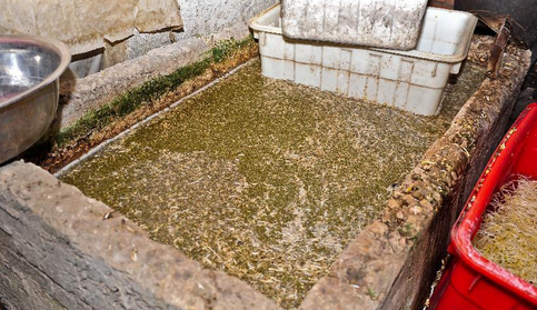 天津蓟县渔阳镇管驿村刘金平家拍摄的漂洗“毒豆芽”的水池,水池的内壁已有绿色的污垢,一池水污秽不堪。(资料图)新华社记者 翟健岚 摄
