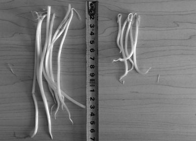 “黑作坊”制售的豆芽(左)和超市销售的豆芽(右)长度形成鲜明对比。京华时报图片