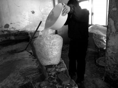 作坊内工人用搅拌有漂白粉的药水给豆芽增白。京华时报图片